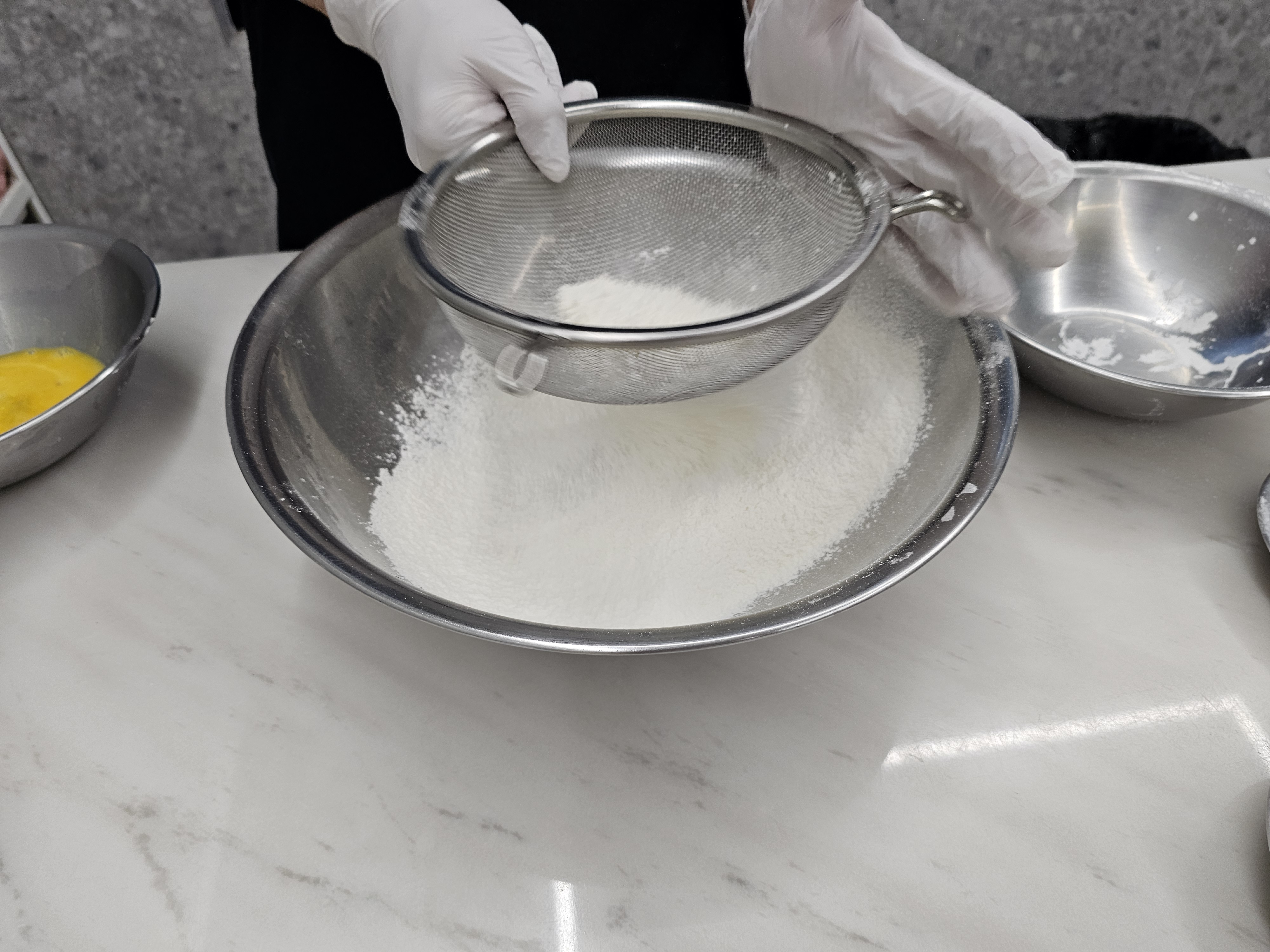 5. 중력분, 박력분 밀가루를 섞어 채를 쳐서 입자를 고르게 한다.