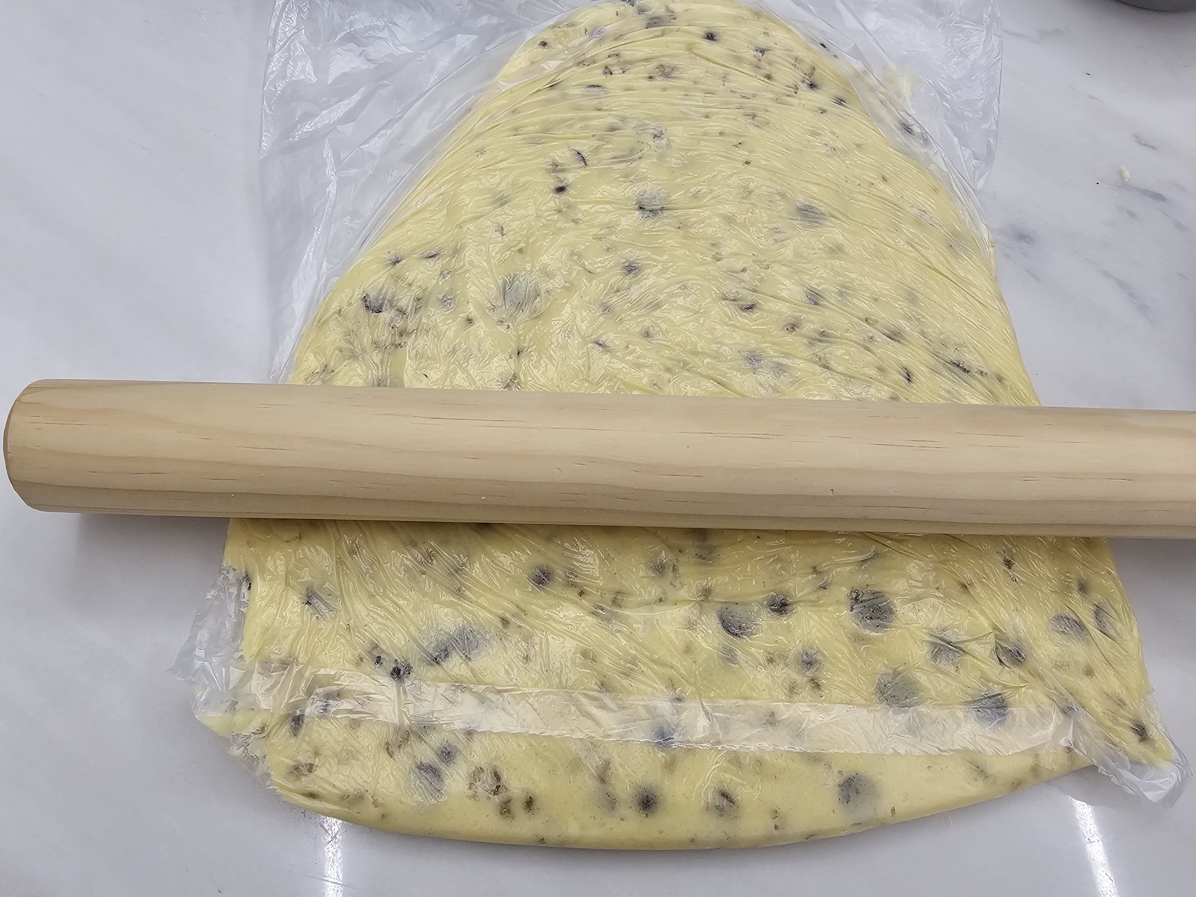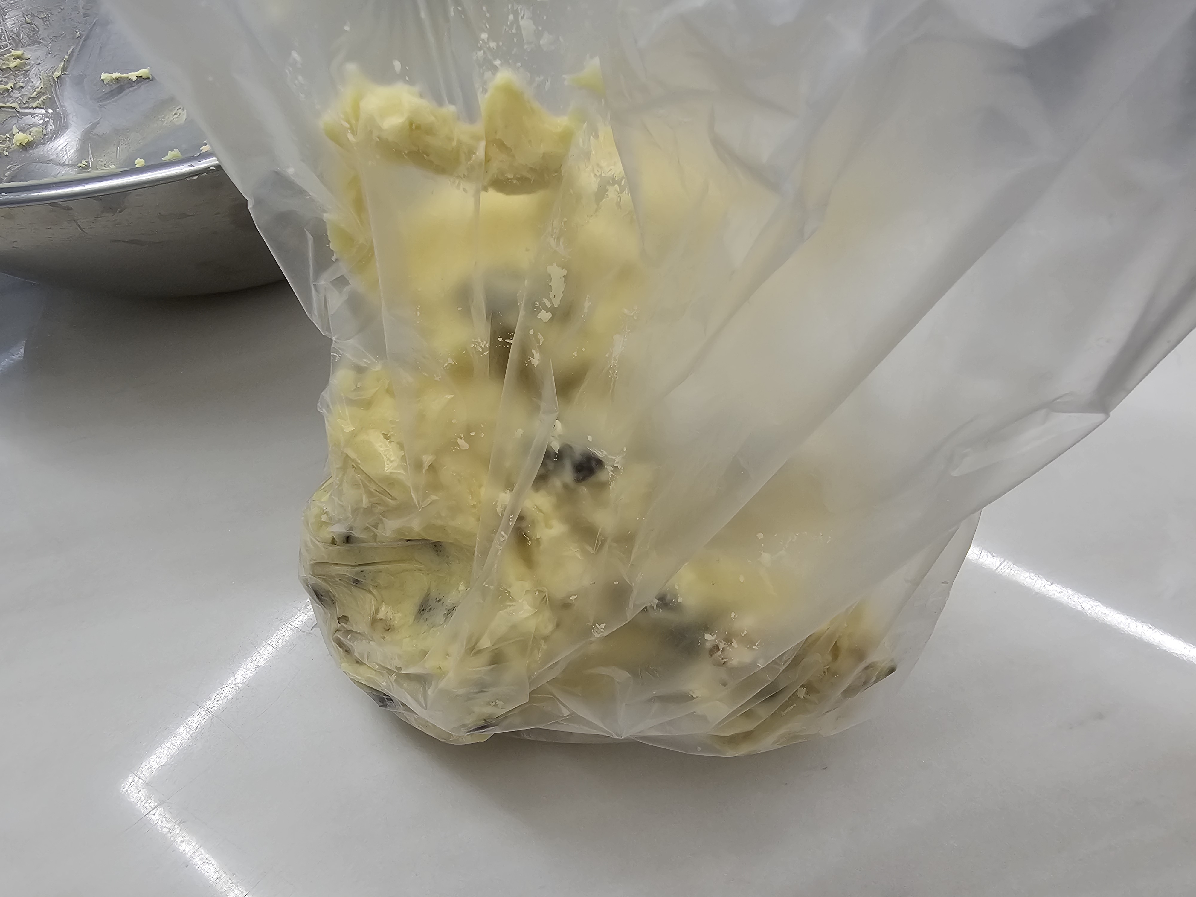 8. 비닐봉지에 반죽한 내용물을 다 넣고 밀대를 밀어 편평하게 한다.