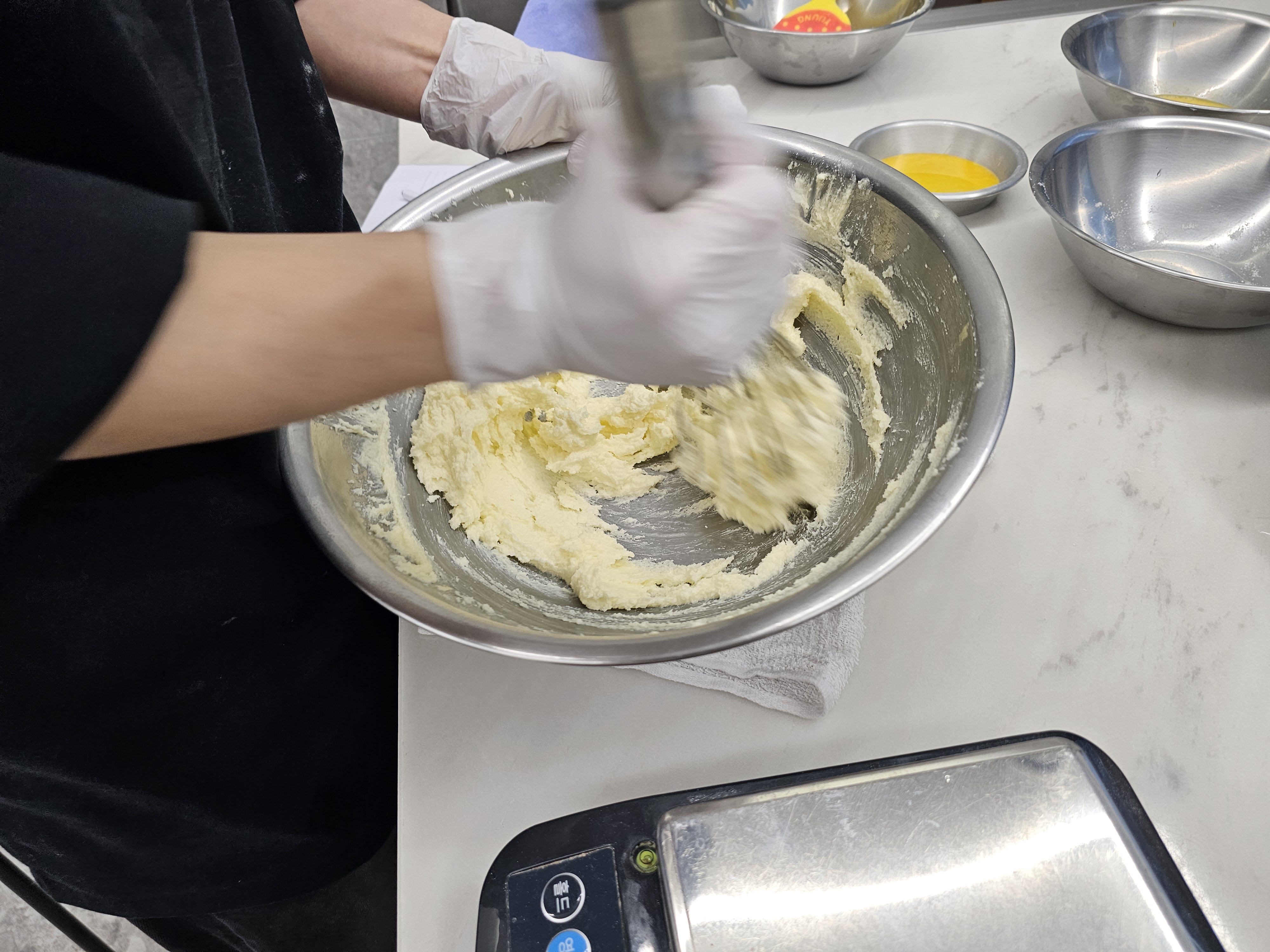 4. 계란+노른자를 2~3번에 나누어 투입하고 저어준다.