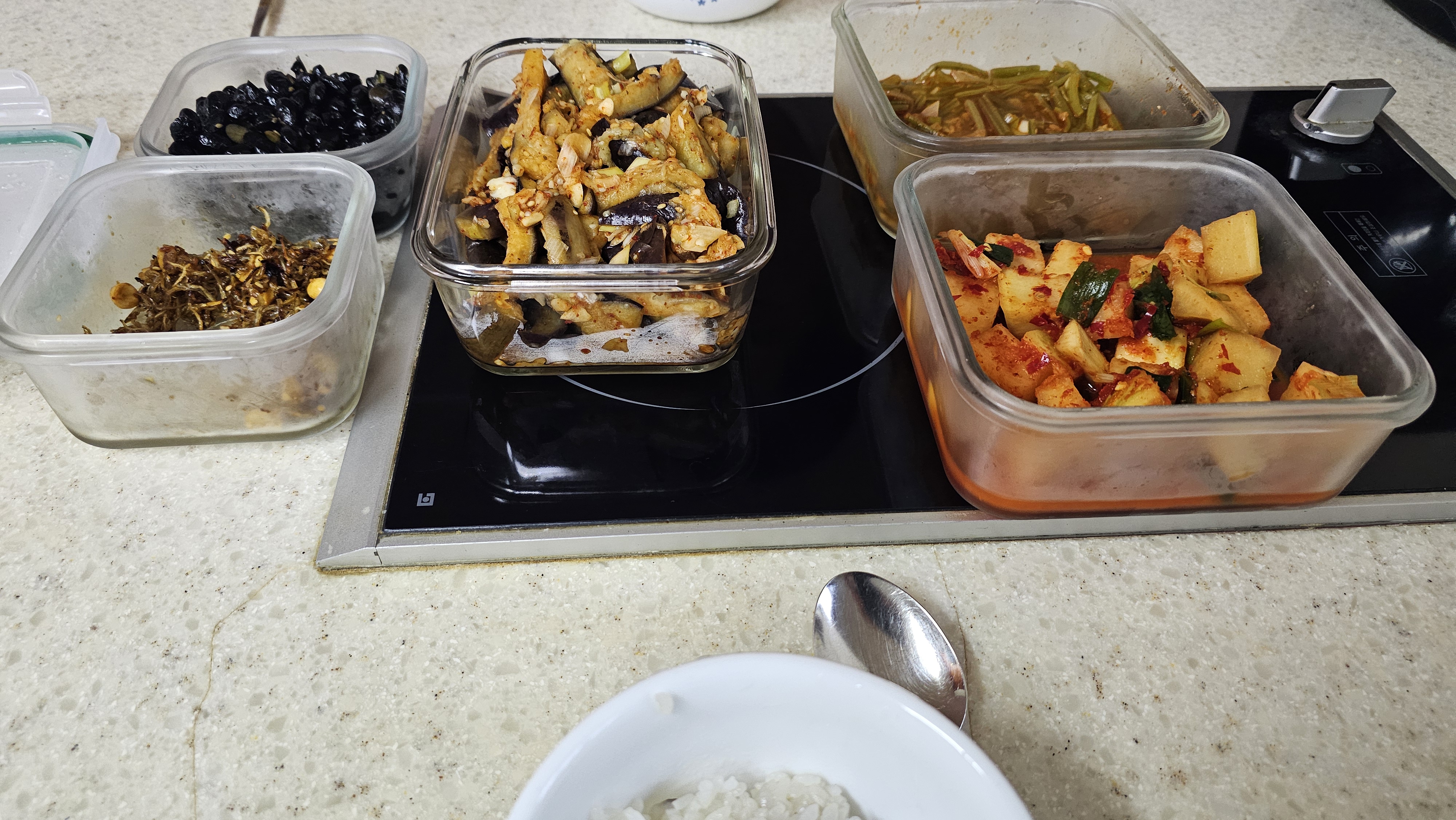 집에서 미역국과 가지나물 반찬으로 아침 점심.