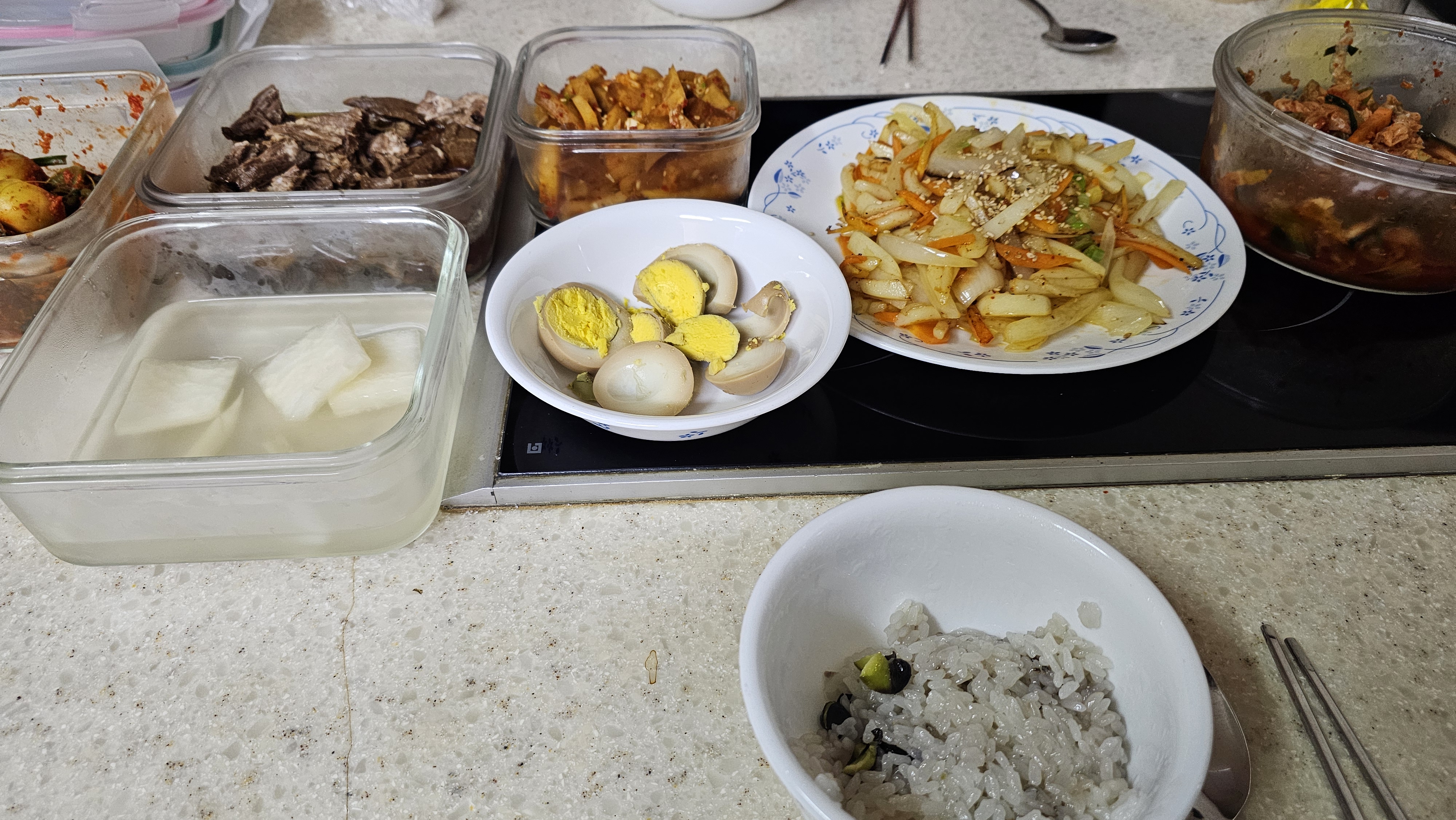 아침에는 오징어 조림과 장조림.