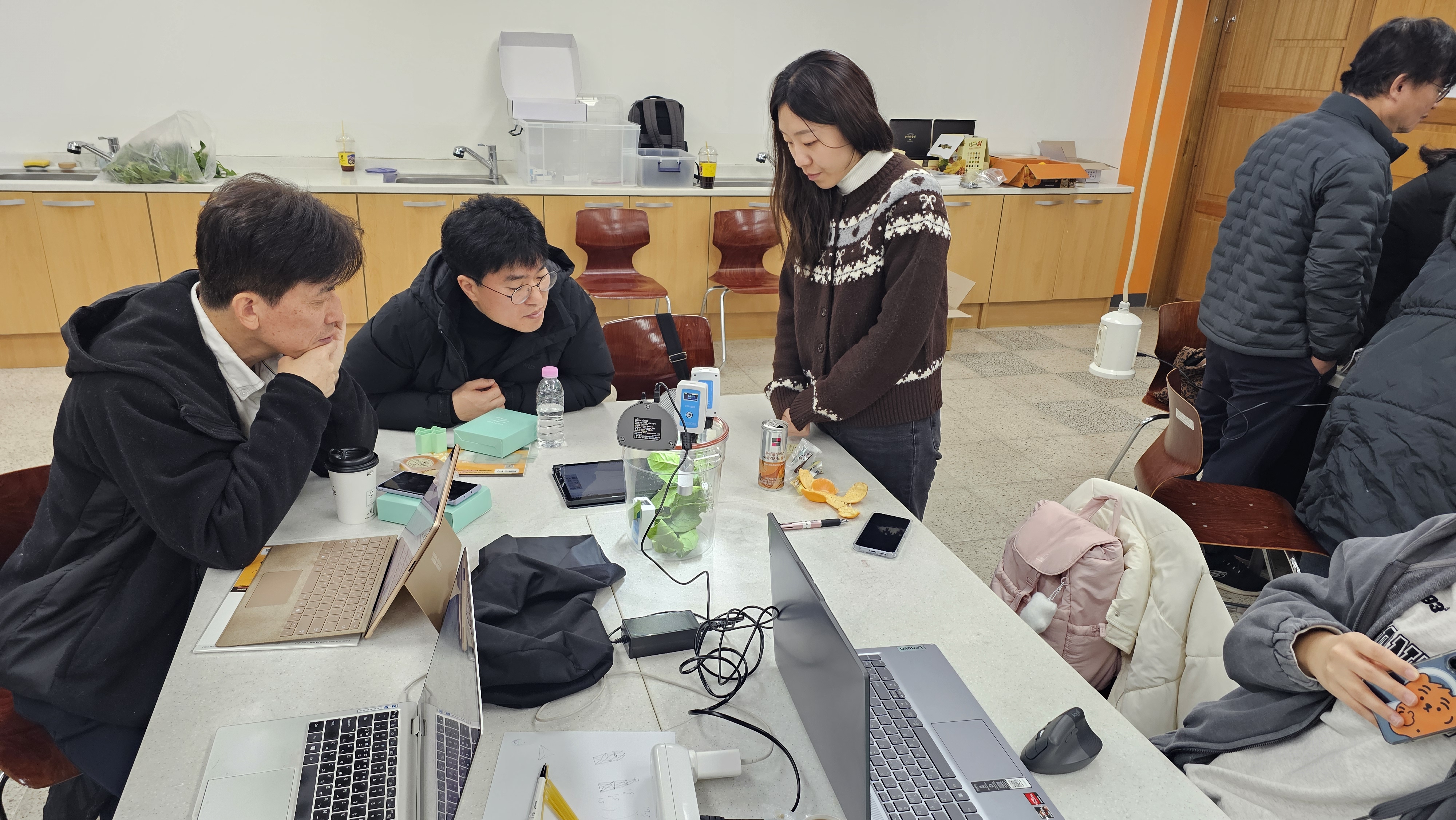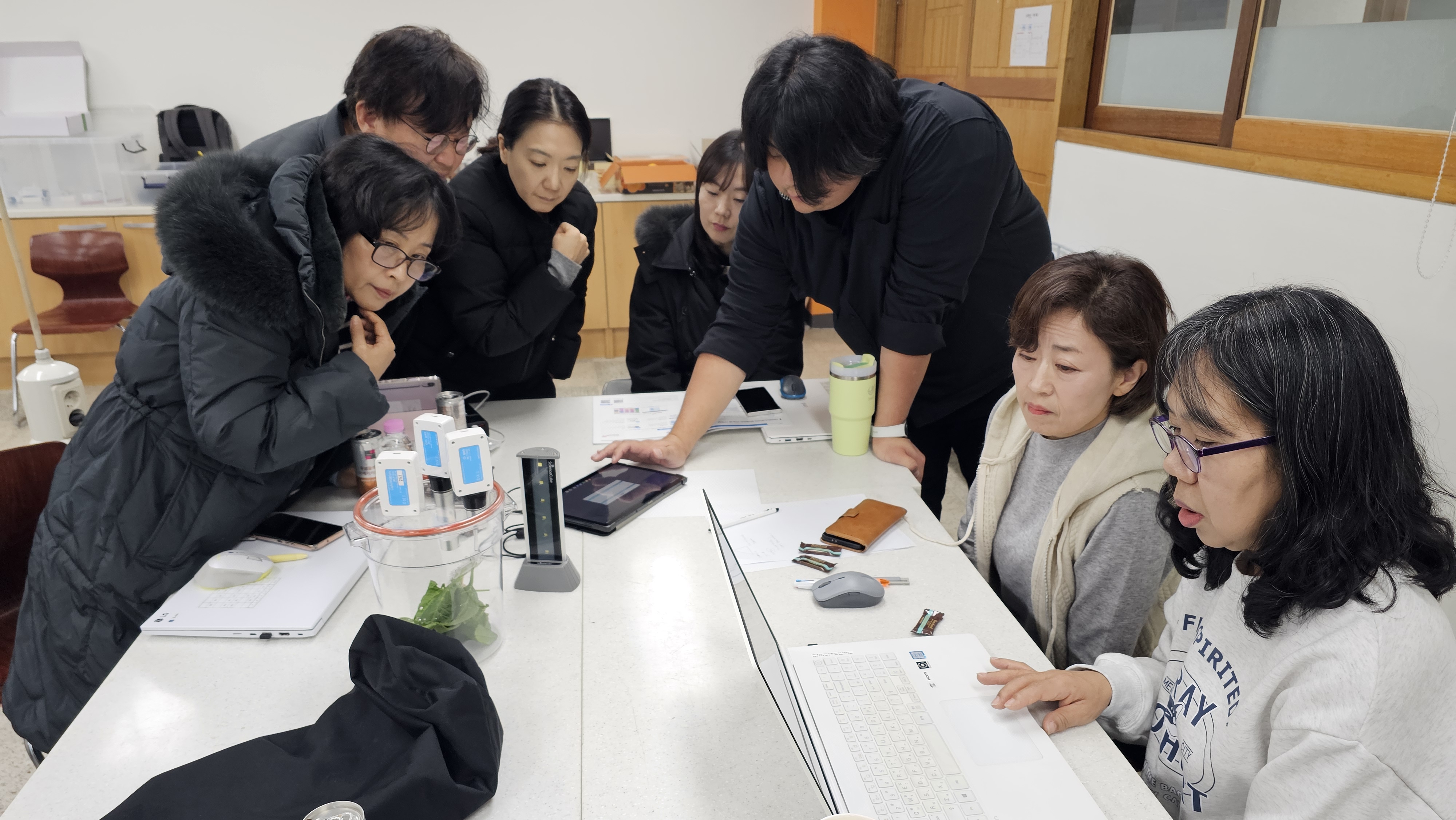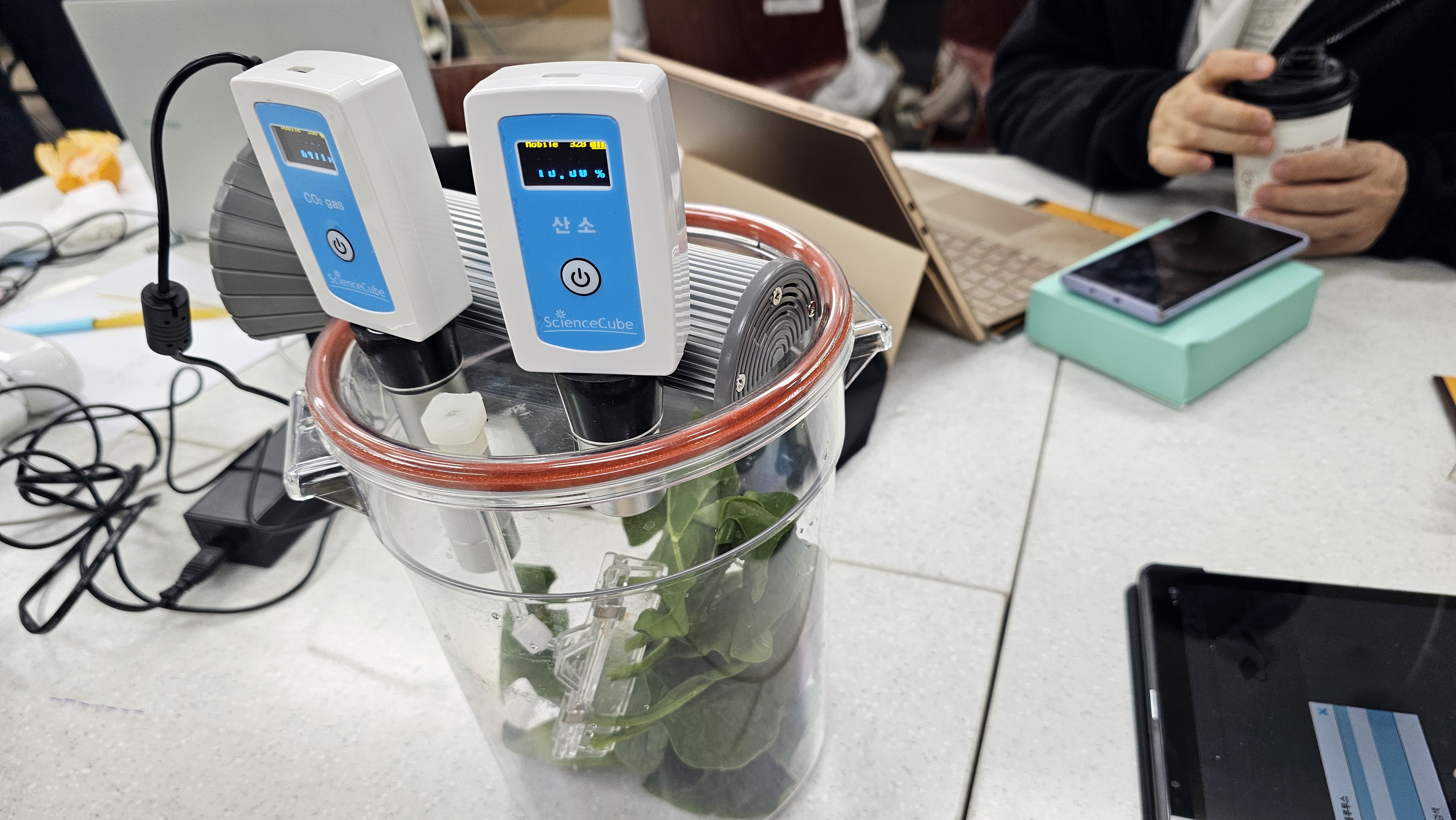 산소센서와 이산화탄소 센서, 온도센서, 빛센서 등을 이용하여 광합성 실험을 하는 시간.