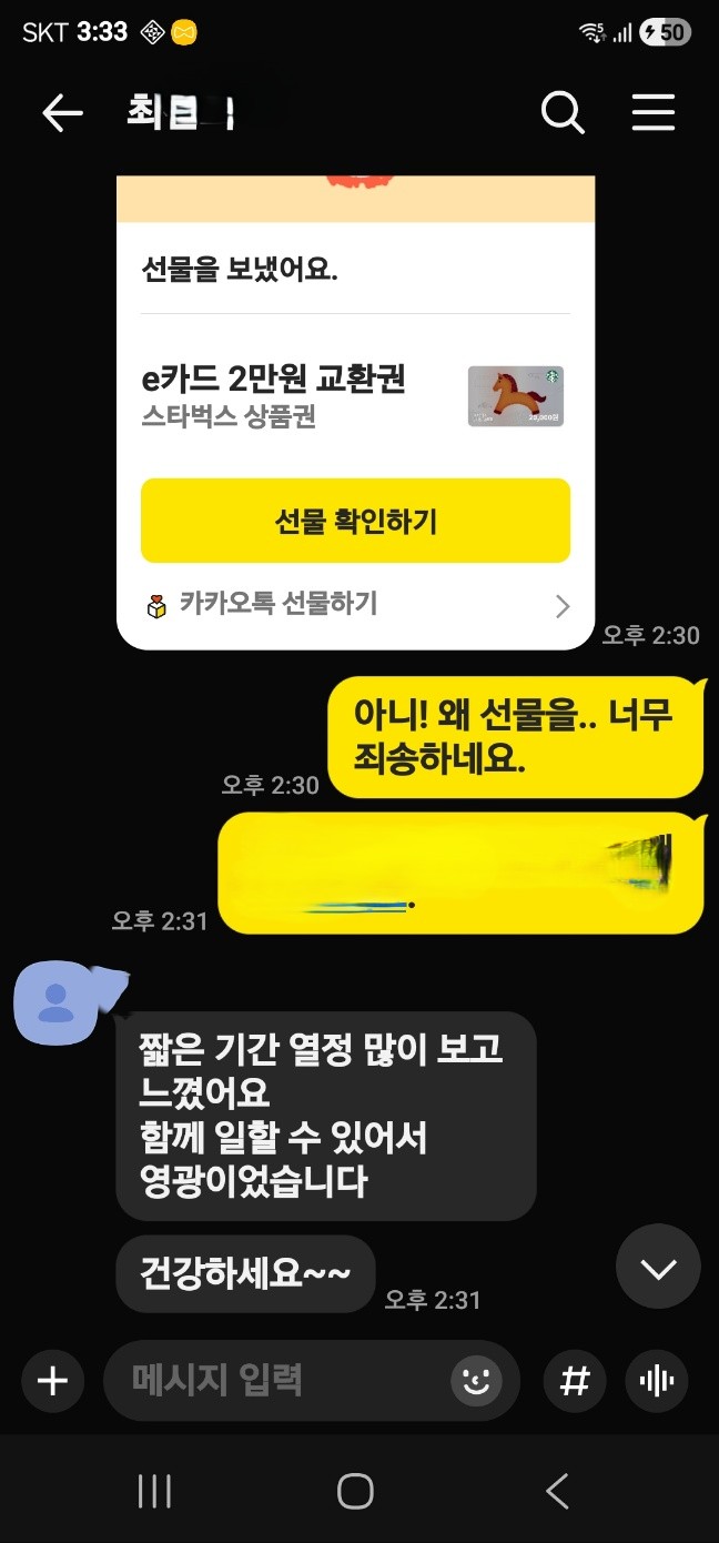 과학부장샘께서는 카톡으로 커피쿠폰을 보내주셨다.