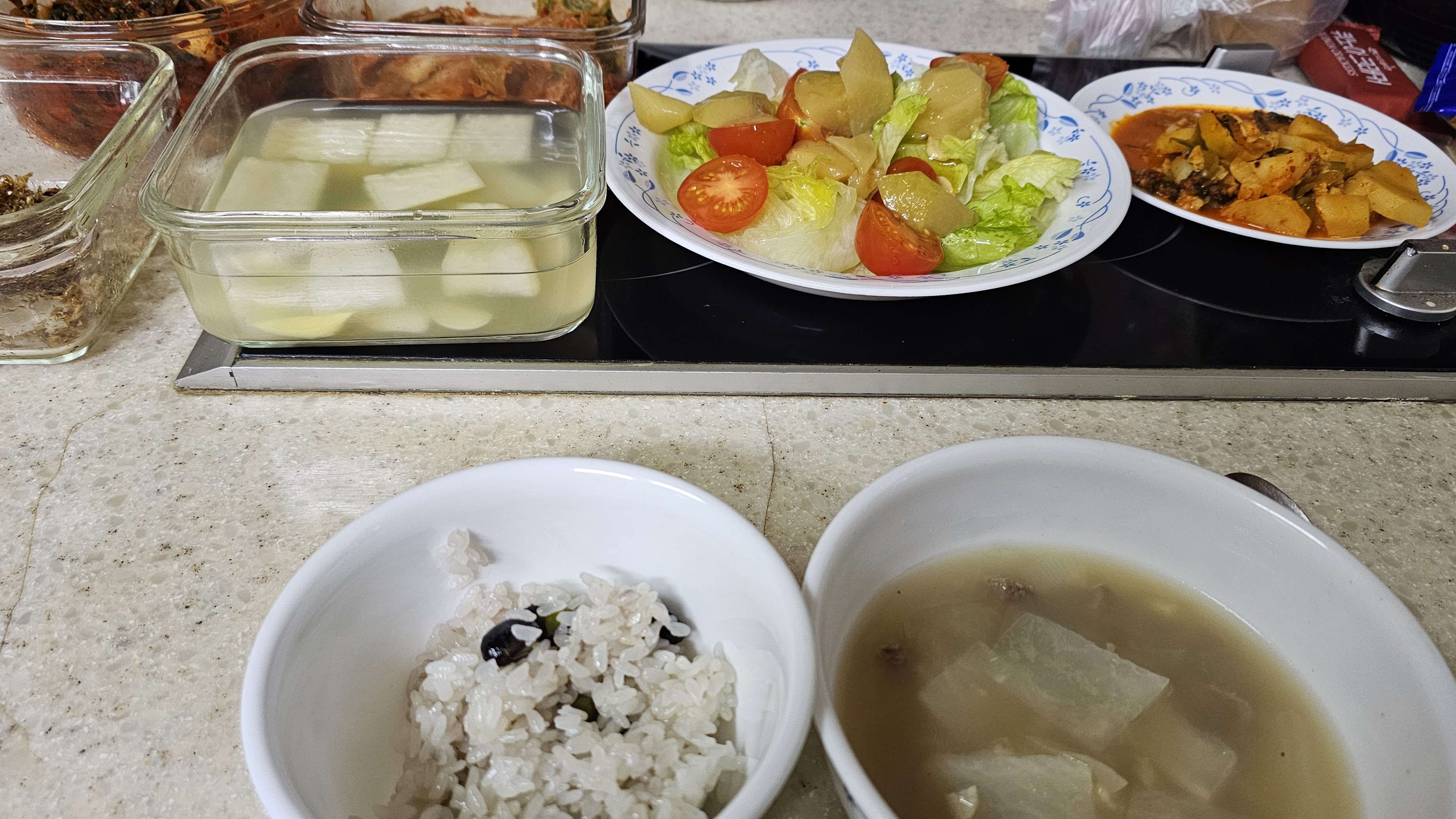 저녁은 남편이 끓여준 맛난 무우국과 감자조림.
